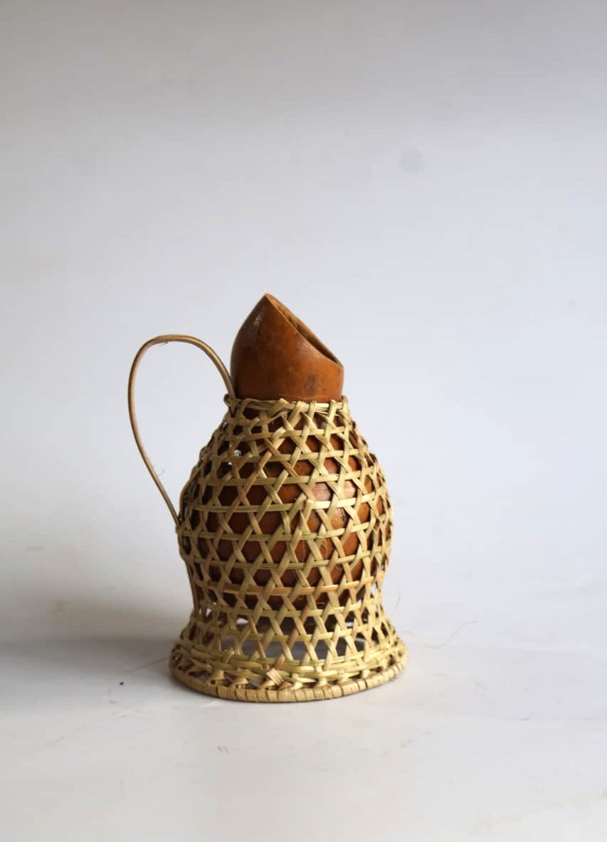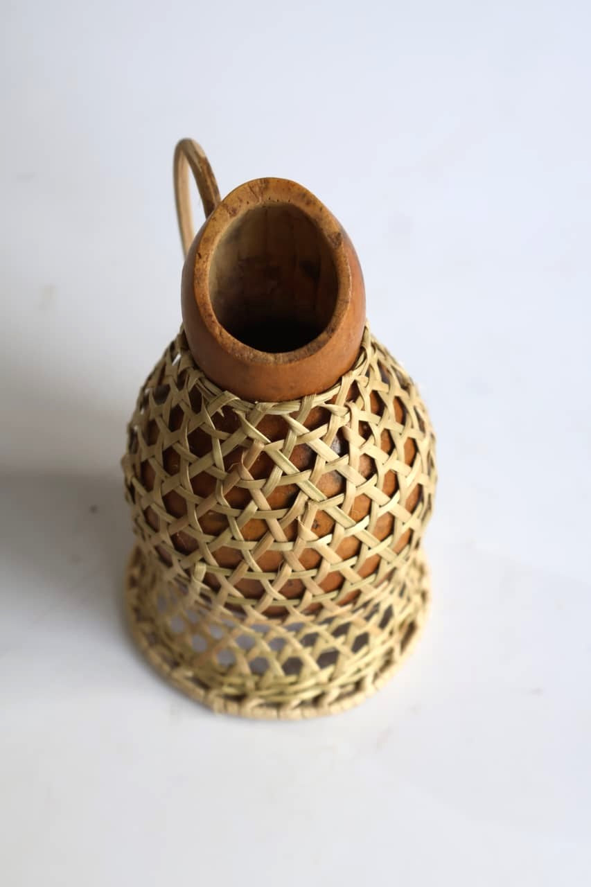 This handcrafted piece, made from a natural bottle gourd encased in a finely woven bamboo frame, brings a warm and rustic charm to any home décor setting. Its curved form and beautifully textured weaving highlight the artistry of traditional craftsmanship, while the handle adds a touch of functional elegance. Perfect as a decorative accent or cultural showcase item, it celebrates sustainable materials and the beauty of handmade design.
