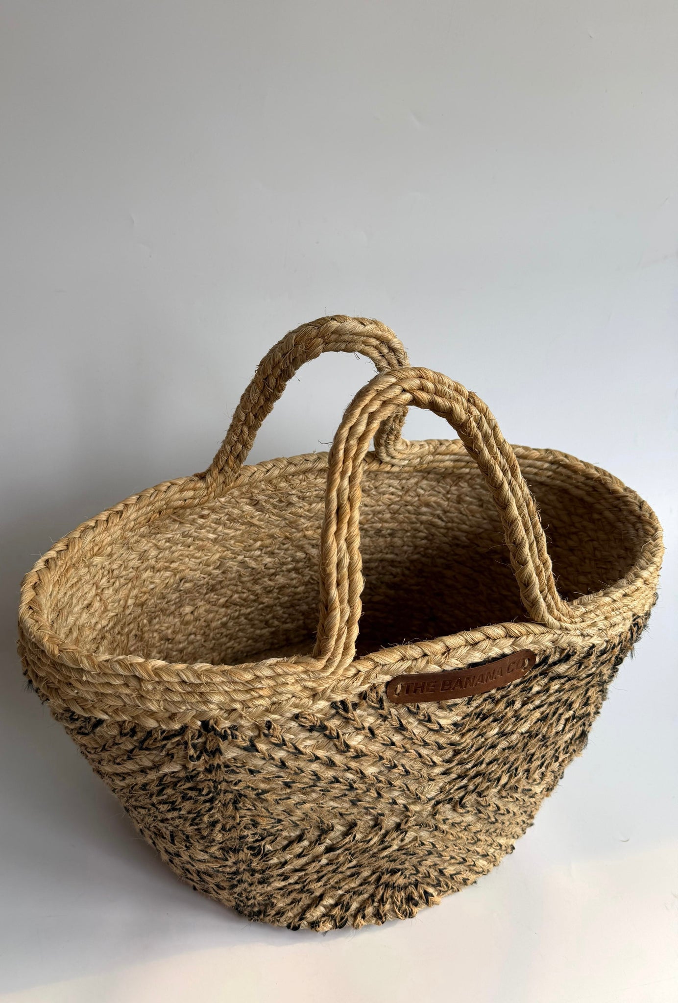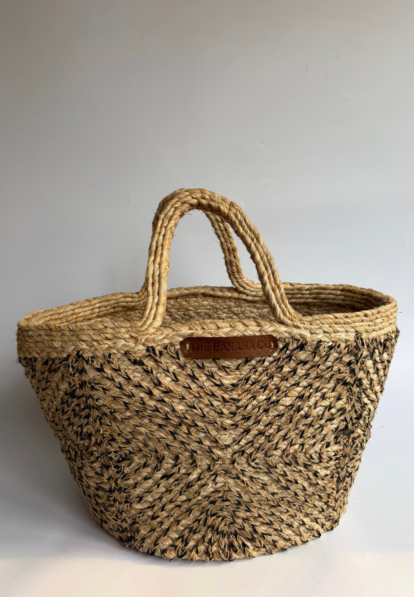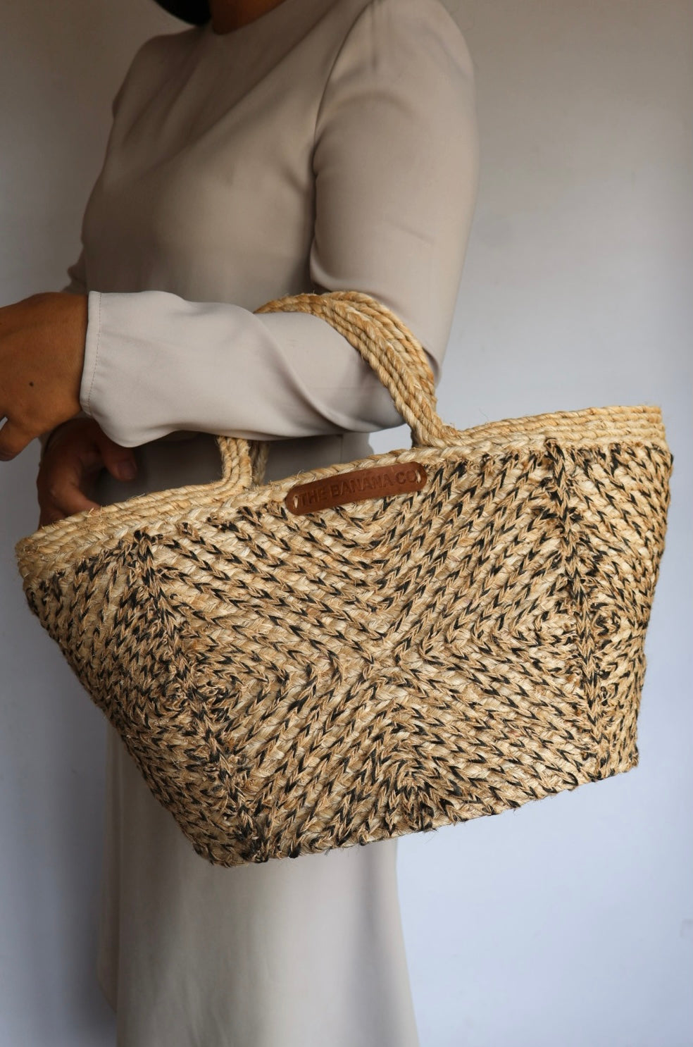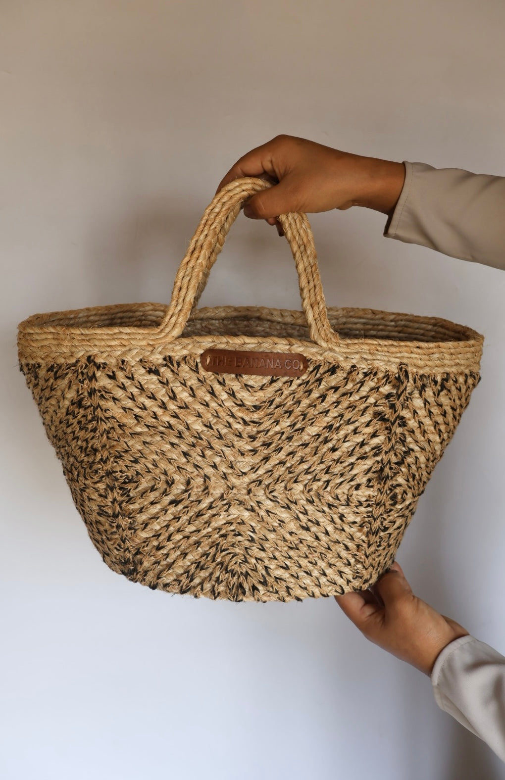Handwoven handbag made from banana fibre with beige and black jute detailing, featuring a sturdy basket shape, double woven handles, and a spacious interior, making it both durable and stylish for everyday use, shopping, or beach outings.