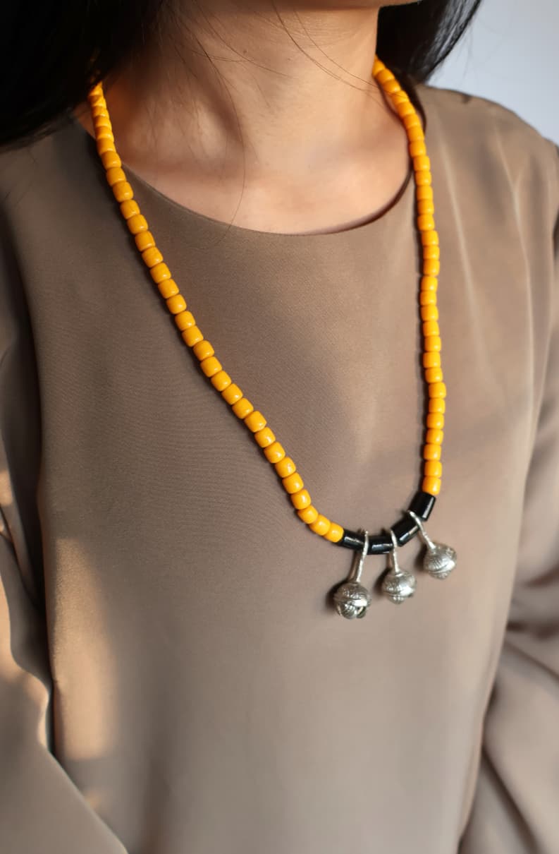 This GTJ timeless necklace is a beautiful blend of simplicity and elegance. Crafted with vibrant yellow beads and accented with black details, it is further enhanced by three silver-toned pendants that add a touch of tradition and charm. Its minimal yet striking design makes it versatile, perfect for both everyday wear and special occasions. A true statement piece, this necklace celebrates heritage while remaining effortlessly stylish across generations.